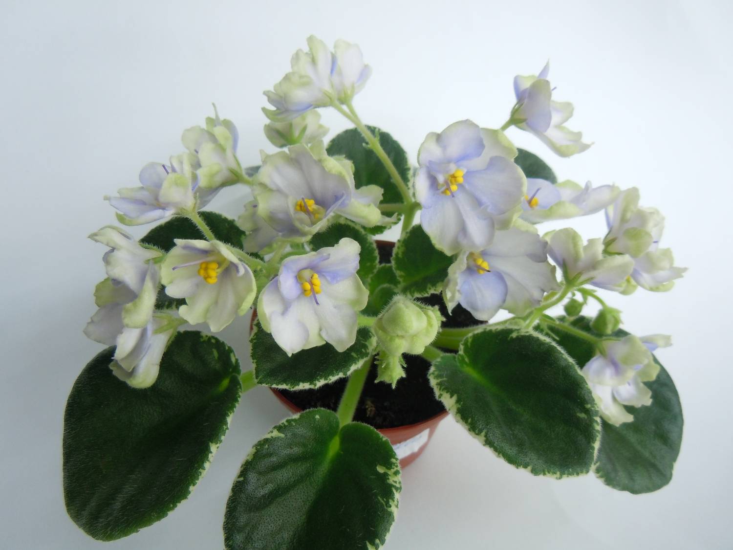 Semidouble white pansy/light blue and green edge. Variegated medium green and white. Standard Бело-голубые с зеленоватым краем цветы в форме колокольчика. Обильнейшее цветение. Компактная, пестролистная розетка.