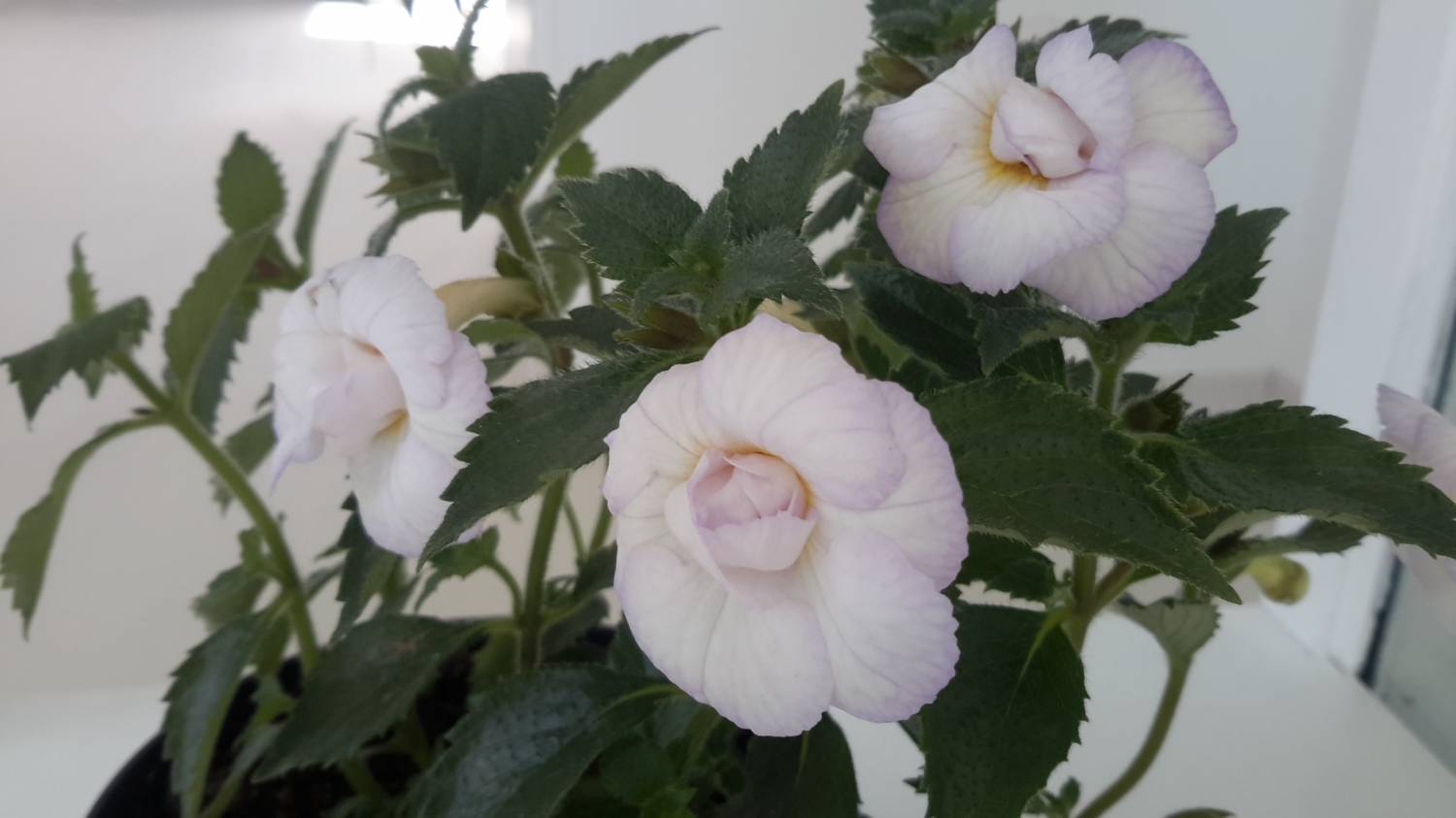 Ахименес Icy Volga (S.Saliba, 2010). Большие махровые белоснежные цветы, зачастую с розово-лиловыми тенями по лепесткам. При прохладном содержании появляется голубоватая подсветка. В центре некрупное золотисто-желтое пятно, нередки дополнительные мелкие лепестки из зева. Листья зеленые зубчатые, стебли прямостоячие. Компактный и эффектный сорт.